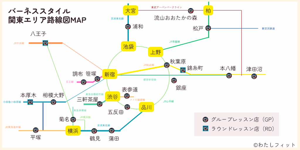 バーネススタイルには2種類の店舗がありますが、津田沼店は予約が必要な「グループレッスン店」です。