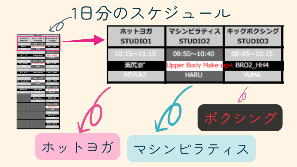 縦3列分が1日のスケジュールを表しており、「ホットヨガ」「マシンピラティス」「キックボクシング」の順に並んでいます。